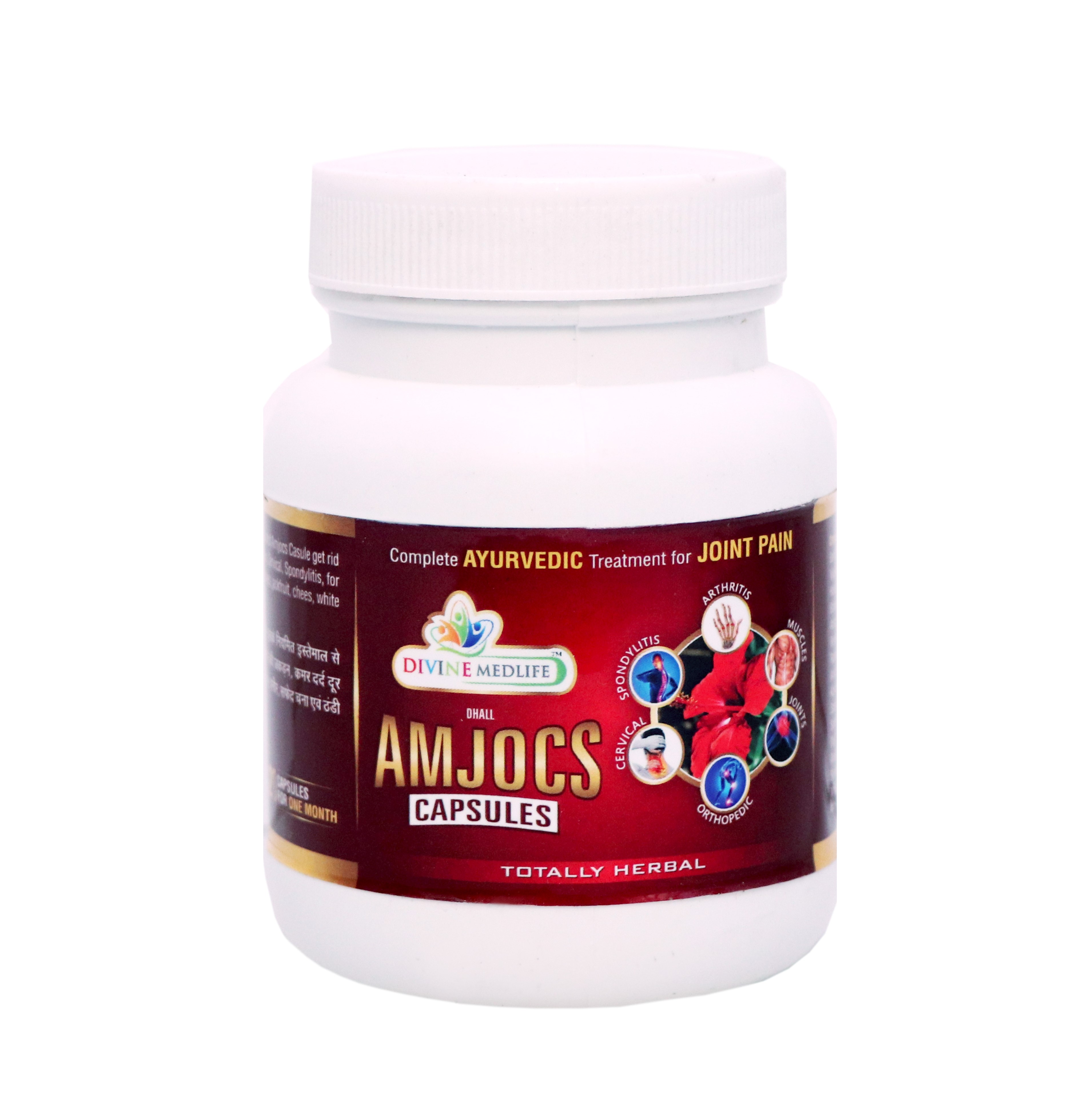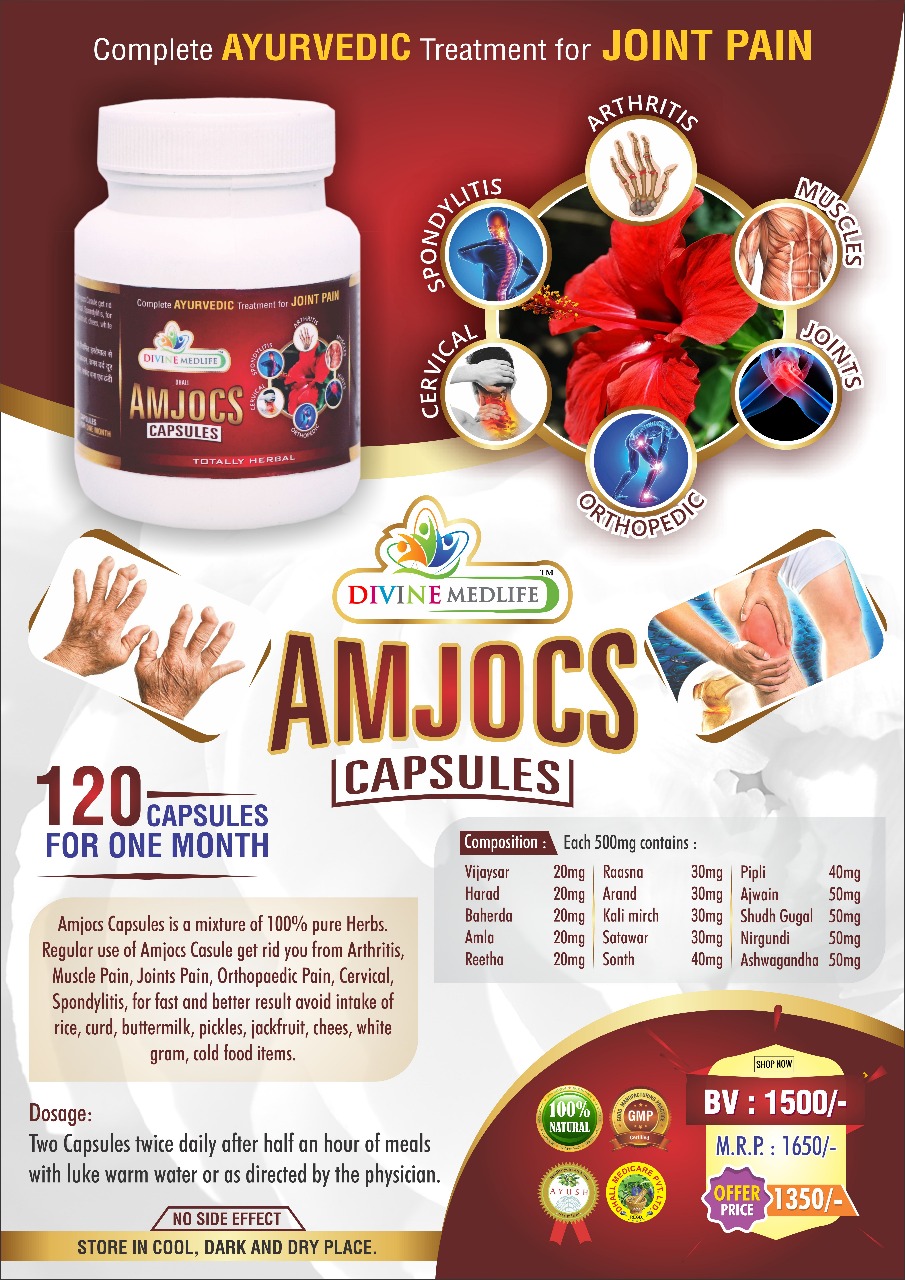 Amjocs Capsules us a mixture of 100% pure Herbs. Regular use of Amjocs Casule get rid you from Arthritis, Muscle Pain, Joints Pain, Orthopaedic Pain, Cervical, Spondylitis, for fast and better result avoid intake of rice, curd, buttermilk, pickles, jackfruit, chees, white grand, cold food items.