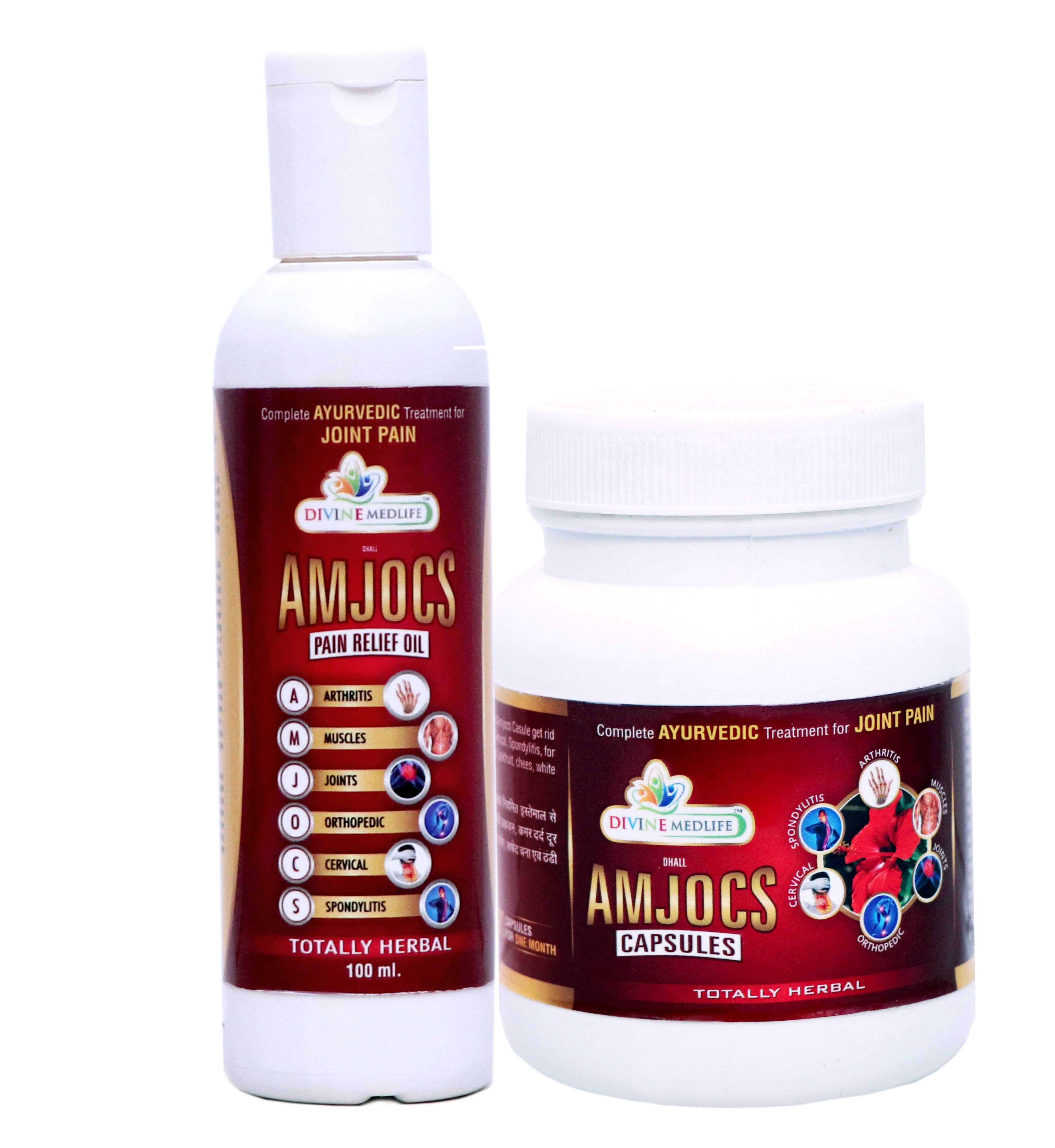 Amjocs Capsules us a mixture of 100% pure Herbs. Regular use of Amjocs Casule get rid you from Arthritis, Muscle Pain, Joints Pain, Orthopaedic Pain, Cervical, Spondylitis, for fast and better result avoid intake of rice, curd, buttermilk, pickles, jackfruit, chees, white grand, cold food items. Composition: Each 500mg contain s: Vijaysar 20mg Harad 20mg Baherda 20mg Amla 20mg Reetha 20mg Raasna 30mg Arand 30mg Kali mirch 30mg Satawar 30mg Sonth 40mg Pipli 40mg Ajwain 50mg Shudh Gagpal 50mg Nigundi 50mg Ashwagandha 50mg Dosage:- Two Capsule twice daily after half an hour of meals with warm luke water or as directed by the physician. STORE IN COOL, DARK AND DRY PLACE. *NO SIDE EFFECT ~~~~~~~~~~~~~~~~~~~~~~~~~~~~~~~~~~~~~~~~~~~~~ Massage of Amjocs Pain Oil five to ten drops till five days on the pain effected area with light hands will relives a person from old joint pain. There will be no sign of pain by the use of this oil for a fee days. Cervical, joint pain and knee pains are completely relived by this oil. Amjoc Pain Oil is completely herbal, its has no side effects. It is a rarest blend of herbs. It is useful oil prepared with best method, taking required oil and massaging it gently on the pain affected area relieves one from cervical waist pain, headache, shoulder pain, back pain, knee pain, ankle pain and swelling too is relived for complete benefit temperance of following items is required rice, curd, butter, milk, pickle, jack fruit cheese white gram and cold things. Composition: Each 100ml contains Dalchini 5gm. Ajwain 5gm. Arand 5gm. Amba Haldi 5gm. Sonth 5gm. Van Methi 5gm. Rai 5gm. Nirgundi 5gm. Lahsun 20gm. Kapoor 50gm. Pudina Sat 50gm. Ajwain Sat 50gm. Til Ka Tel q.s *FOR EXTERNAL USE ONLY *NO SIDE EFFECT