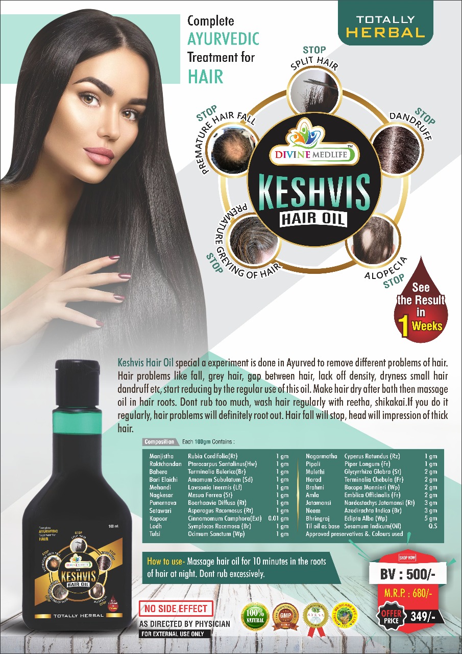 **Keshvis Hair Oil** Totally Herbal for He/ She No Side Effects Stop Alopecia Stop Dandruff Stop Premature hair fall Stop Split hair Stop Premature Greying of hair "Dhall Keshvis Hiar Oil" special a experiment is done in ayurved to remove different problems of hair. Hair Problems like hair fall, grey hair, gap between hair, lack of density, dryness small hair dandruff etc. start reducing by the regular use of this oil. Make hair dry after bath then massage oil in hair roots don't rub too much, wash hair regularly with reetha, shikakai or with Dhall Keshvis Hair Shampoo if you use regularly, hair problems will definitely root out, hair fall will stop, head will impression of thick hair. Composition Each 100gm Contains Manjistha (RT) 1gm Raktchandan (Hw) 1gm Bahera (Br) 1gm Bari Elaichi 1gm Mehandi 1gm Nagkesar 1gm Punernava 1gm Satawari 1gm Kapoor (Ext) 0.01gm Lodh 1gm Tulsi 1gm Nagarmotha 1gm Pipali 1gm Mulethi 2gm Harad 2gm Brahmi 2gm Amla 2gm Jatamansi 3gm Neem 3gm Bhringraj 5gm Tol oil as base Sesamum indicum(Oil) Q.S. *FOR EXTERNAL USE ONLY *NO SIDE EFFECT As directed by physician