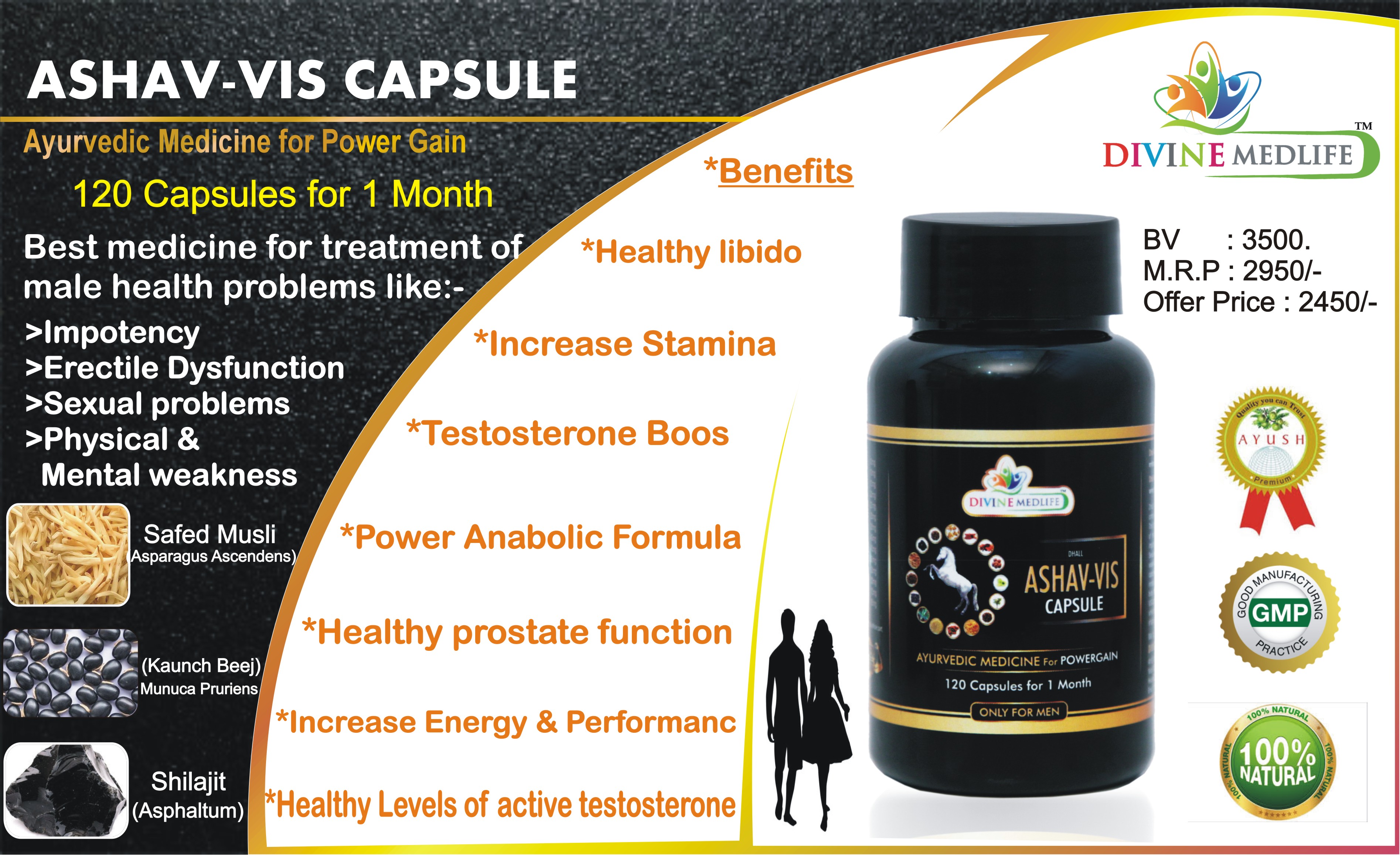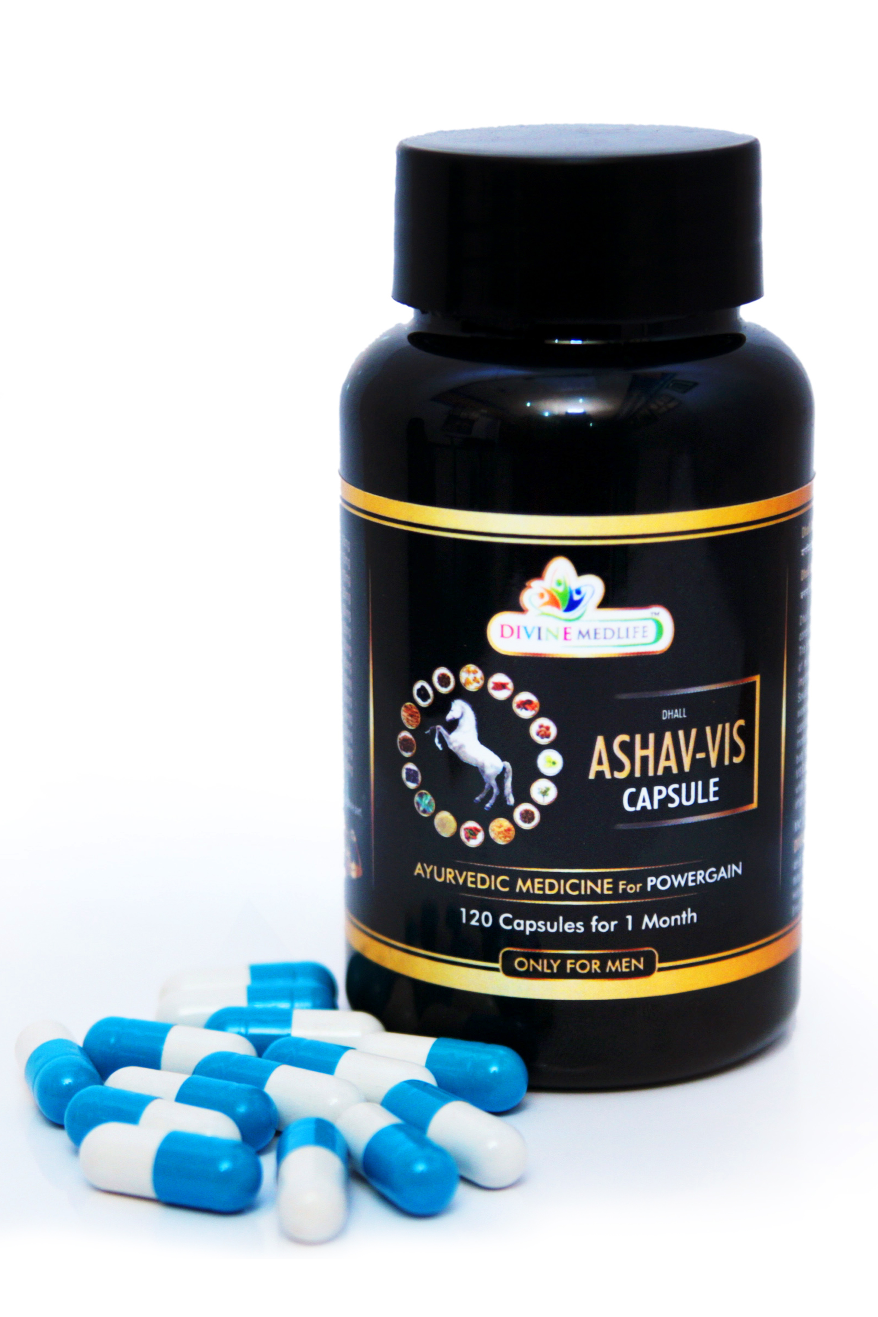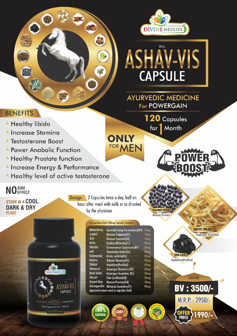 ASHAV-VIS CAPSULE Ayurvedic Medicine for Power Gain *Best medicine for treatment of male health problems like:- Impotency, Erectile DysfunctionSexual Problems, Physical & Mental weakness. *Benefits *Increase Stamina *Increase Energy & Performance *Healthy libido *Healthy Prostate function *Healthy level of active testosterone *Power Anabolic Function *Testosterone Boost Composition each, 500mg capsule contains:- Makardhwaj - 10mg Jaiphal- 10mg Tulsi- 10mg Amla- 20mg Dalchini- 20mg Imli- 20mg Salampanja- 20mg Gokhru- 40mg Shilajit- 40mg Shatawari- 50mg Safed musli- 50mg Khareti- 50mg Kaunch Beej- 70mg Ashwagandha- 90mg No side effects Store in a cool, dark and dry place Dosage: 2 capsules twice a day ,half an hour after meal with milk or directed by the physician *120 capsules for 1 Month.
