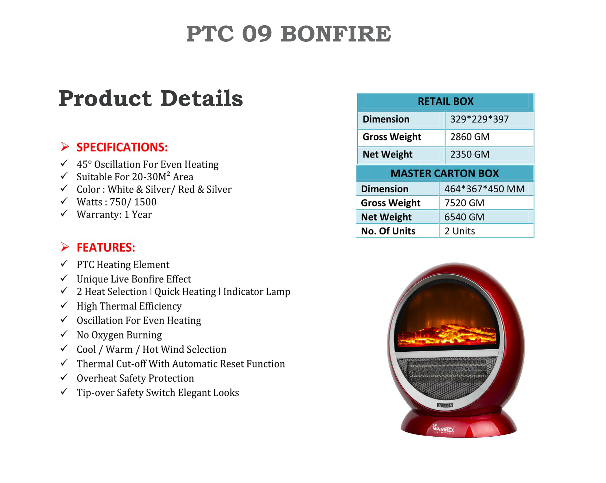 Unique Live Bonfire Effect & 2 Heat Selection PTC Heating Element, Quick Heating & High Thermal Efficiency Indicator Lamp, Oscillation For Even Heating & No Oxygen Burning Cool / Warm / Hot Wind Selection Thermal Cut-off With Automatic Reset Function Overheat Safety Protection & Tip-over Safety Switch Elegant Looks